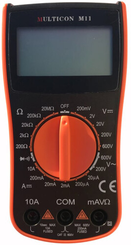 Цифровой мультиметр MULTICON M11 является карманным тестером базового уровня. Прибор представляет собой надежный цифровой мультиметр с батарейным питанием. Для улучшения чтения показания в приборе применен жидкокристаллический дисплей 3 ½ знака (максимальная индикация «1999», высота знаков 22 мм). Мультиметр на задней панели имеет откидную подставку-упор для его установки на рабочем месте с целью удобства считывания показаний.